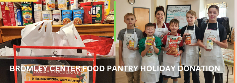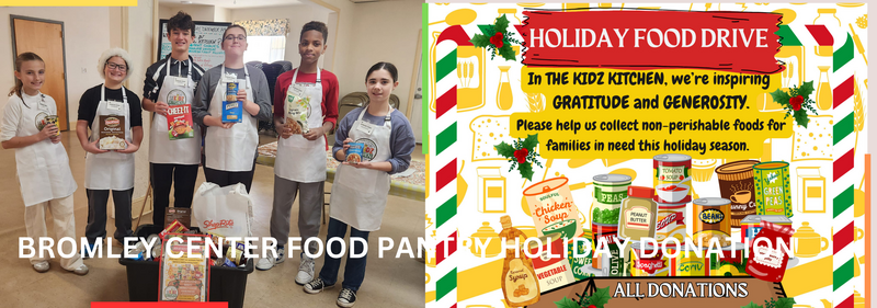 - The Bromley Center Food Pantry – We donated approximately 100 non-perishable goods collected by our Kidz Kitchen families during the 2024 holiday season.